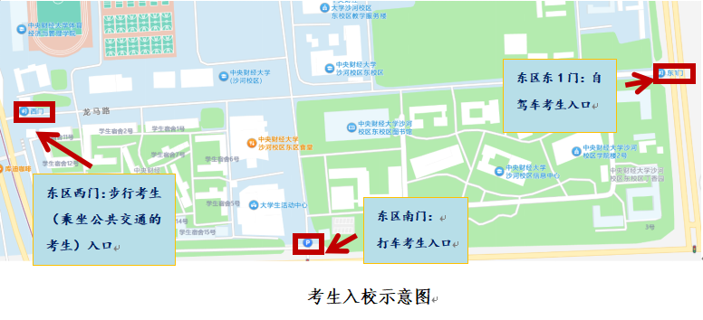 自驾车考生:请凭准考证从沙河校区东区东门驶入(导航至中央财经大学沙河校区东区-东1门,切勿导航至西区),入校后按照保安引导停车。