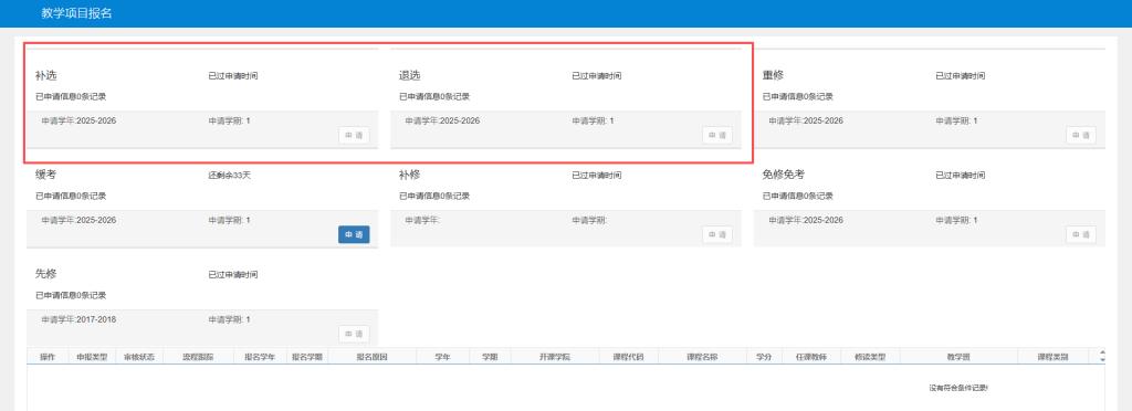 选课截止后,如需进行特殊补退选课的同学于3月9日9:00至3月13日23:59,通过“报名申请—教学项目报名—补选/退选”进行申请并说明具体原因。
